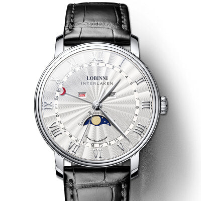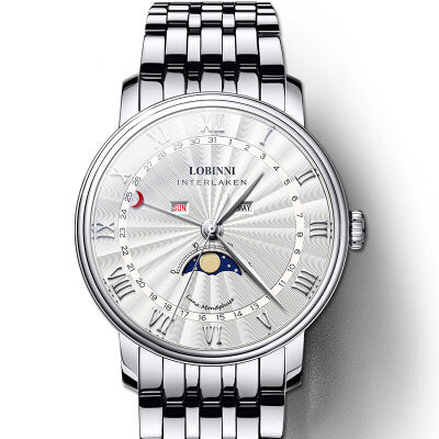 LOBINNI Luxury brand is of high-quality quartz movement. This Switzerland Movement watch has an auto date, calendar and moon phase display.