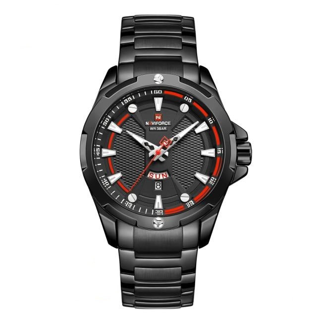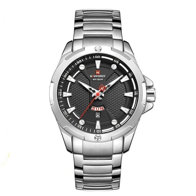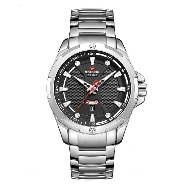 This Men Stainless Steel Waterproof Operates on a quartz movement. The has a dial diameter of 45mm and a bandwidth of 23mm. It has a complete calendar and a luminous display.