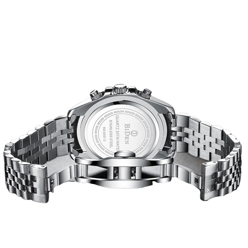 The Full Steel Waterproof Quartz Watches operate on a Japanese Quartz movement. It has a dial diameter of 46mm and a bandwidth of 24mm. It has a sports chronograph dial with an auto-date complete calendar and luminous display.
