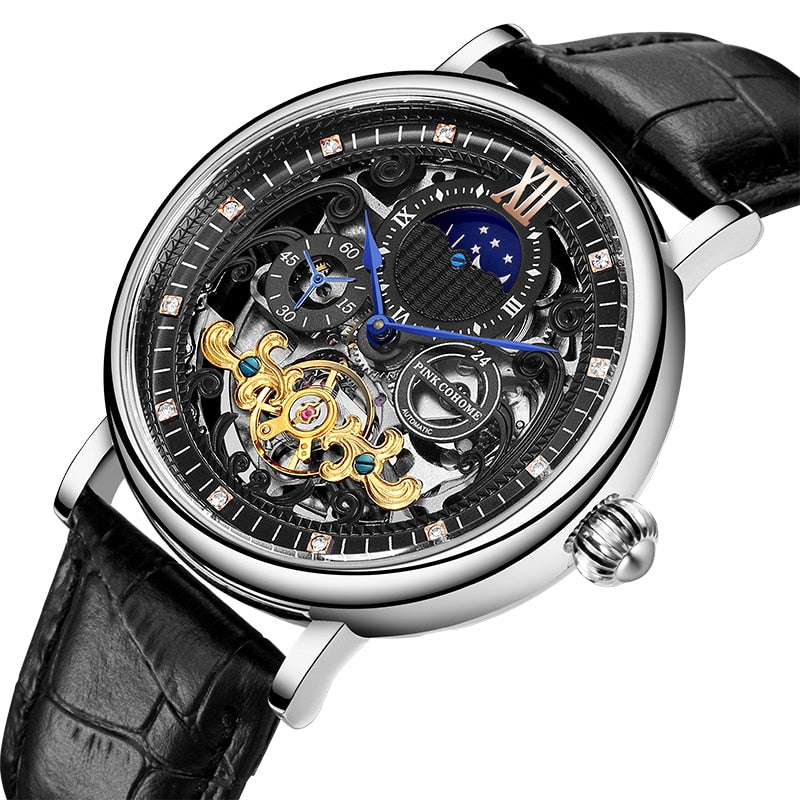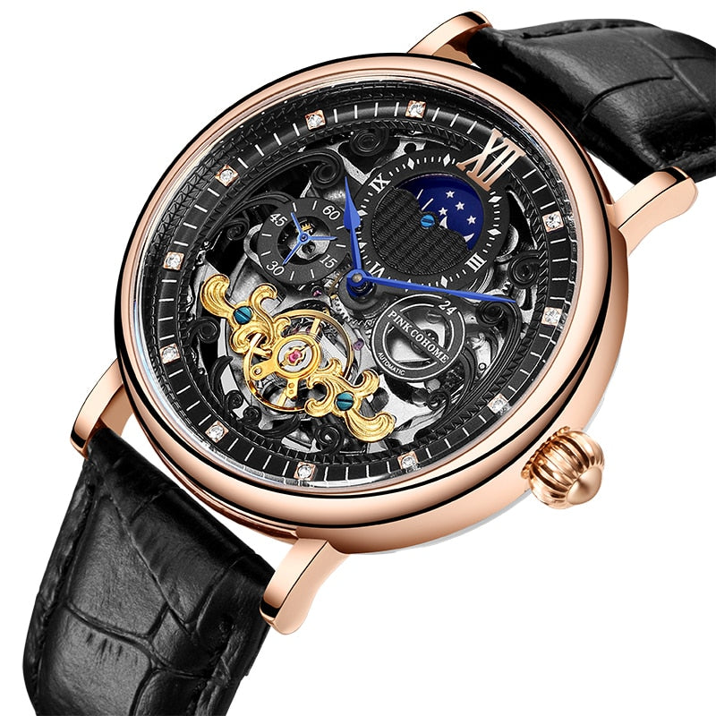 The watch Thin Case Luxury Tourbillon Skeleton has a mechanical automatic self-winding movement. The watch has a stainless steel case and crystal mineral sapphire non-scatch glass. It has a dial diameter of 44mm and a bandwidth of 22mm. The style of the watch is round-body.