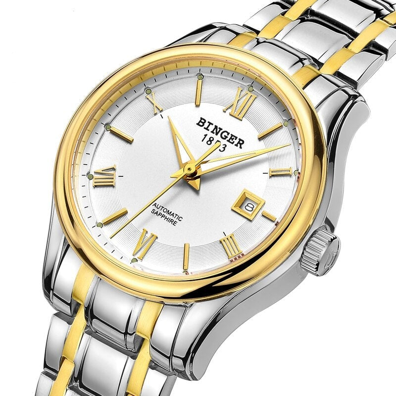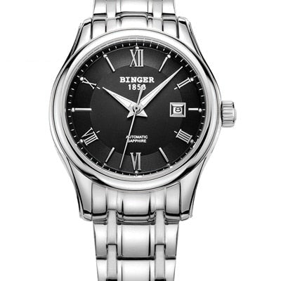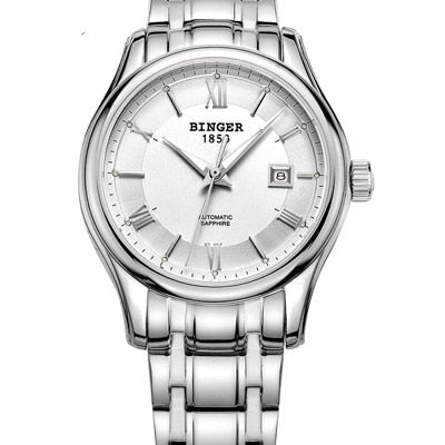 BINGER top brand women's watch is made of mechanical self-wind movement with auto date, waterproof and diving capabilities. The waterproof watch has a sapphire mineral crystal anti-scratch glass. This women's wristwatch has a dial diameter of 26mm and a bandwidth of 15mm.