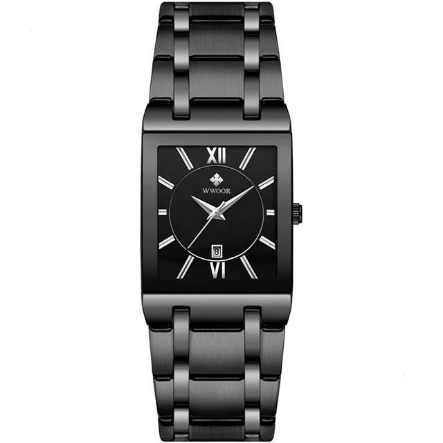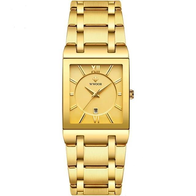 The waterproof watch work on a high-quality quartz movement. The watch has a shining gold or black finish. This watch is ideal for fashion ladies or executive men with a taste for fashion. It has a dial diameter of 41mm and a bandwidth of 20mm in a square shape.