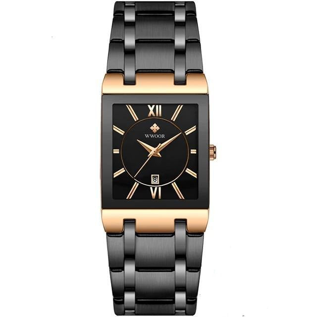 Our Black Gold Waterproof Watches feature minimalist square frames, elegantly crafted from luxuriously durable gold-plated stainless steel. Ensuring the timelessness of a classic silhouette, each piece is water-resistant, creating a perfect blend of style and functionality.