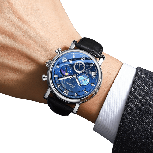 The genuine leather strap ensures a comfortable fit and long-lasting durability, while the 44mm round dial with a moon phase display adds a touch of elegance and sophistication.